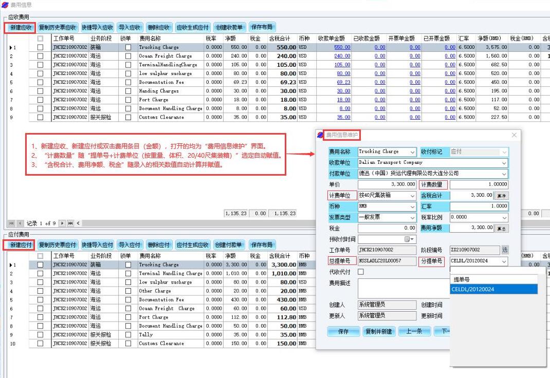 4、点击 [新建应付] 或 [新建应收] 按键,打开“费用信息维护”界面,录入具体费用数据。