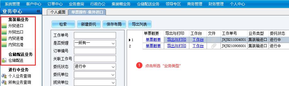 1、在个人桌面左侧导航栏选择业务类型,点击进入列表界面。