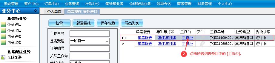2、点击所选列表条目中的 [工作台],打开“单票工作台”界面。