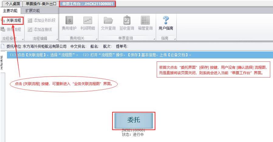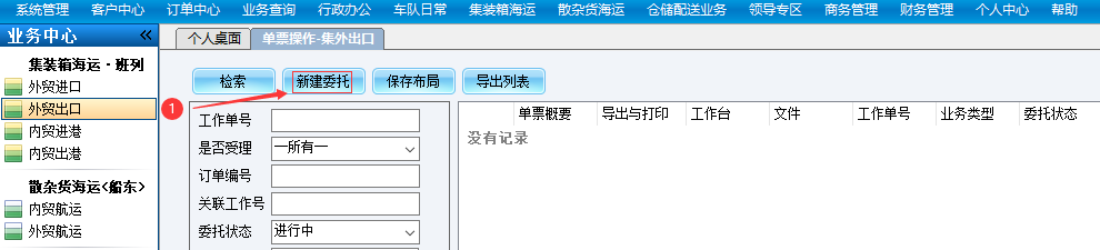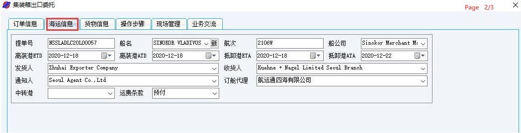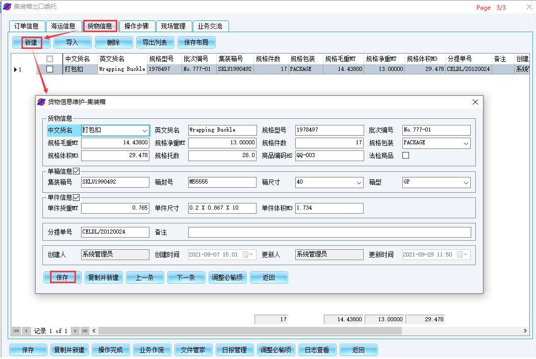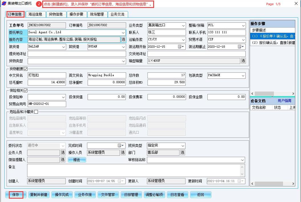 2、点击[新建委托],录入并保存“订单信息、海运信息和货物信息”。
