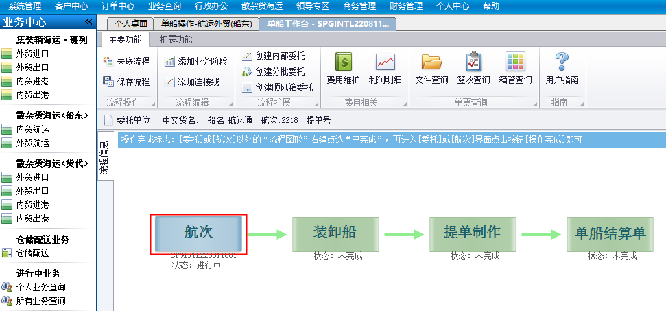 7、双击流程图中的[航次],点击“航次界面”的[单票信息],添加并保存本航次单票信息。