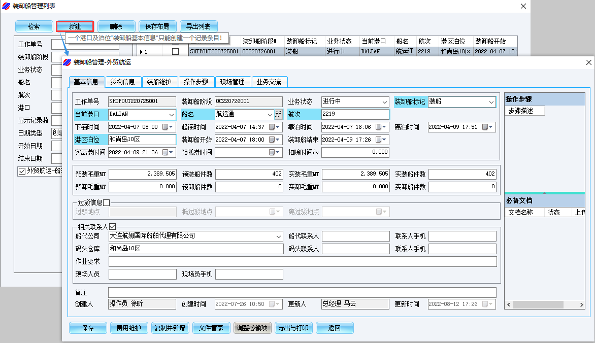 1、双击流程图中[装卸船], 点击[新建] -录入并保存“基本信息”。(NOTE:一个“当前港口+港区泊位”只能创建一条记录条目!)