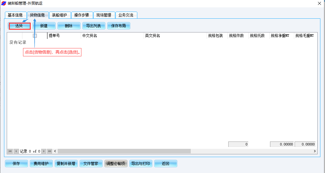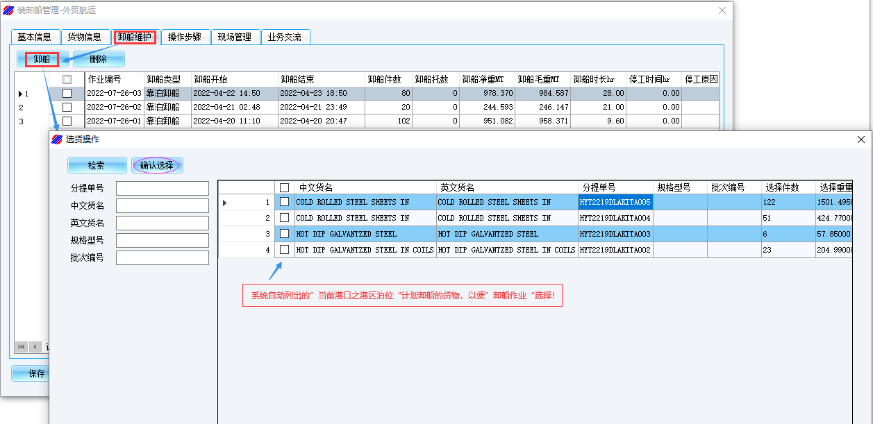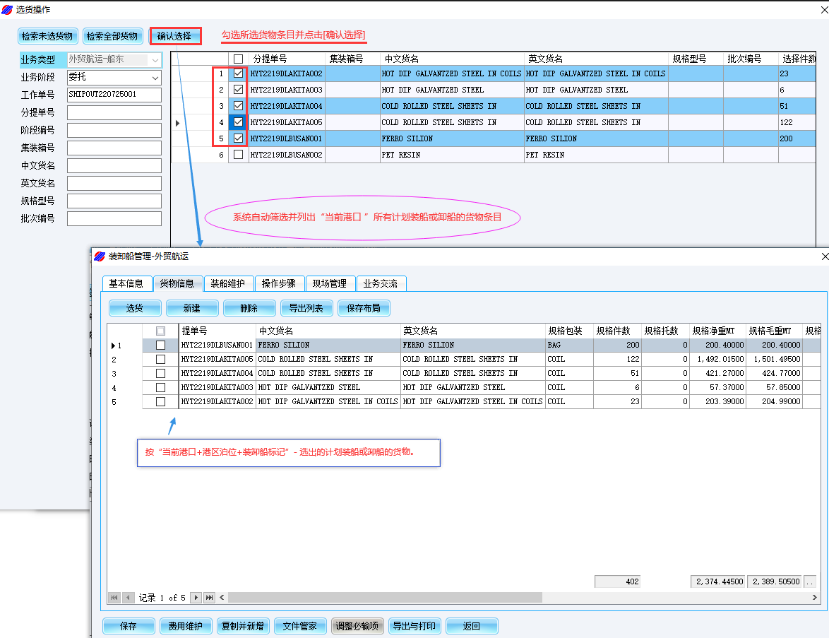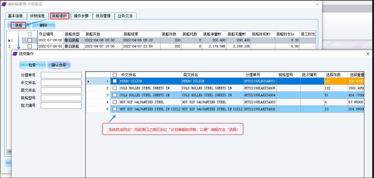 2、 点击[装卸船-货物信息],再点击[选货]按键,勾选当前“港区泊位”计划装船或卸船的货物条目-[确认选择]。