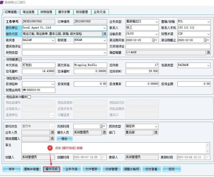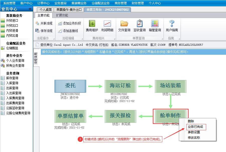一票业务/一个航次[操作完成]的标志:“单票工作台/单船工作台”之“SOP流程图形”除 [委托/航次] 以外均已右键点选”业务已完成“,再点击“委托/航次界面”的 [操作完成] 按键。