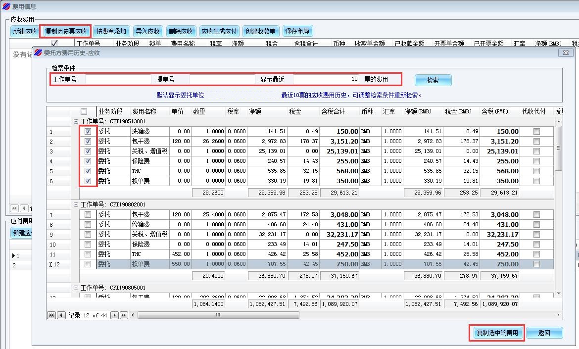1. 点击工作台上方【费用录入】,点击【复制历史票应收】,系统默认显示同一委托单位最近10票的应收费用,用户可通过调整检索条件重新检索。勾选需要复制的费用,然后点击【复制选中费用】。