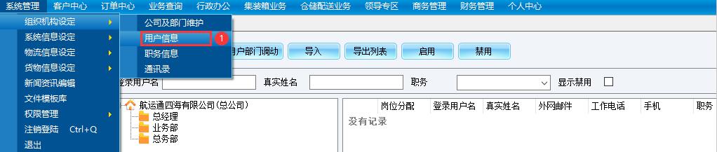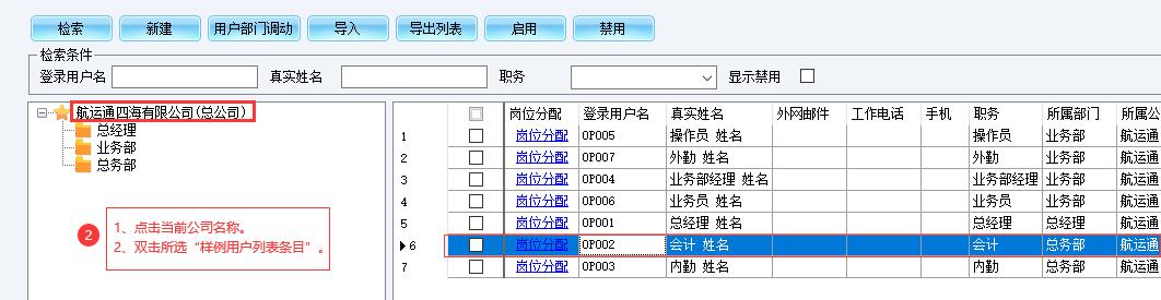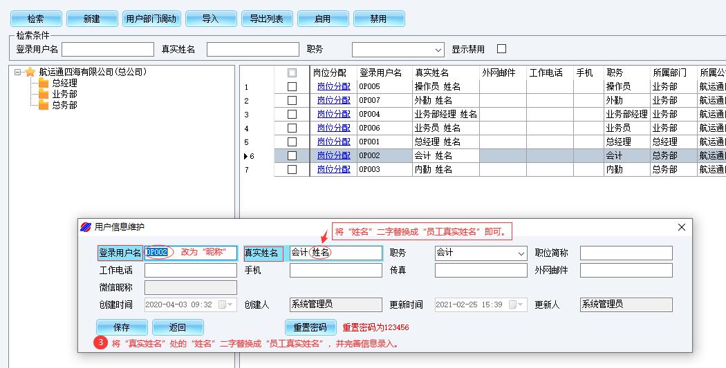 航运通V6.0/V5.0内置了七种样例个人用户,岗位职务为:总经理、会计、业务部经理、操作人员、业务人员、内勤、外勤,您只需将贵司员工真实姓名录入在“姓名”处即可,具体步骤如下: