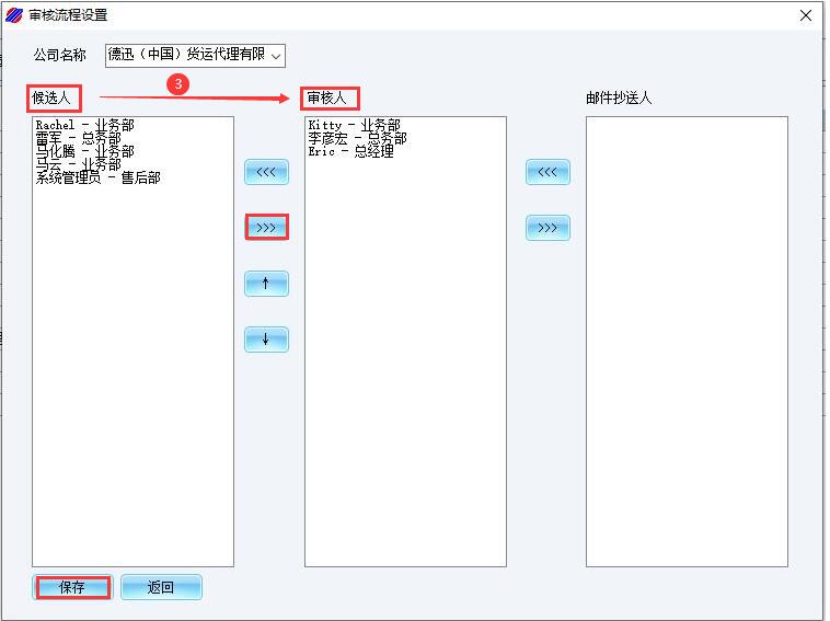 3、审核模板【保存】后,打开【审核流程设置】界面,在“候选人”列表中选择审核人员,点击【>>>】按钮,将选定人员加入“审核人”列表。