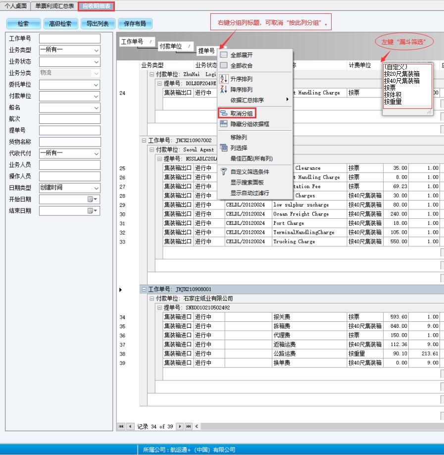 航运通V 6.0“列可编辑综合报表”有五个,即:应收明细表、应付明细表、单票利润汇总表、单票利润分析表<锁单&调账>、调账明细表。