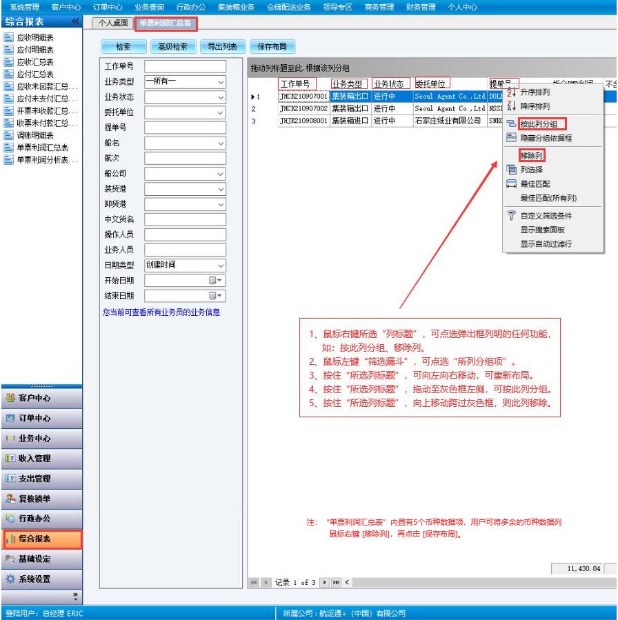 “列可编辑报表”是指具有可按 [列标题] “列分组、移除列、列移动、列筛选”等功能的报表。