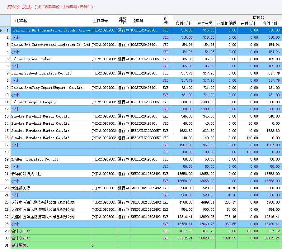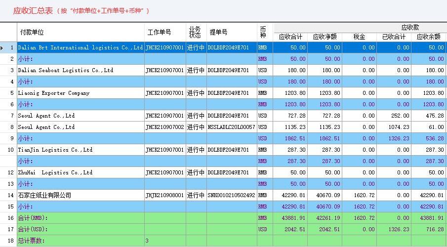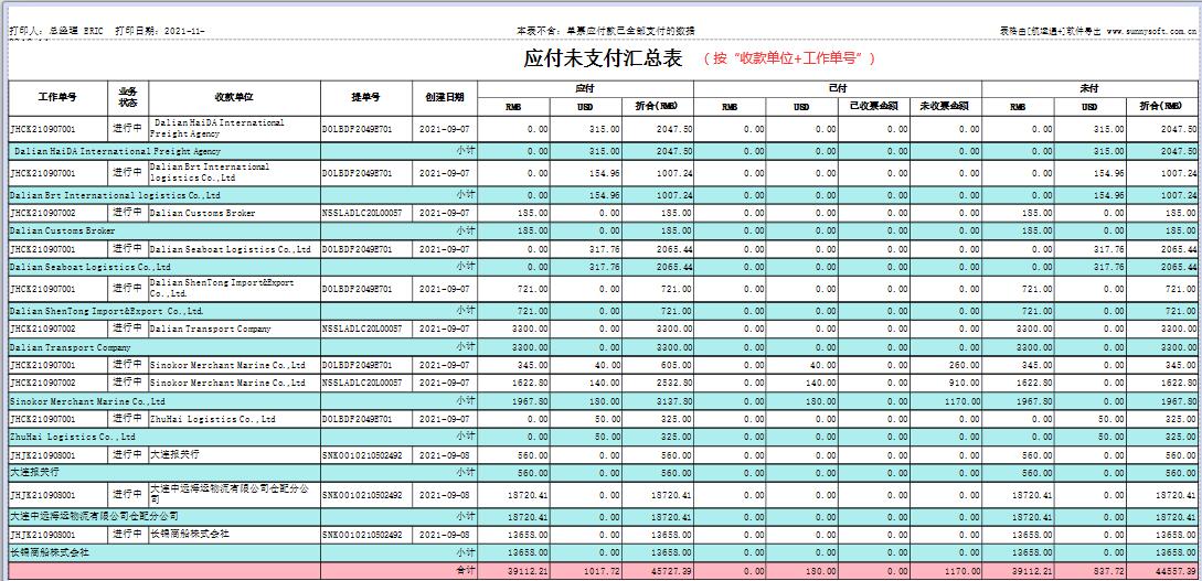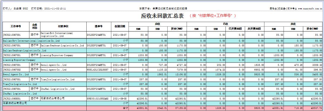 航运通V 6.0“固定格式报表”有五个,即:应收汇总表、应付汇总表、应收未回款汇总表、应付未支付汇总表、开票未收款汇总表、收票未付款汇总表。
