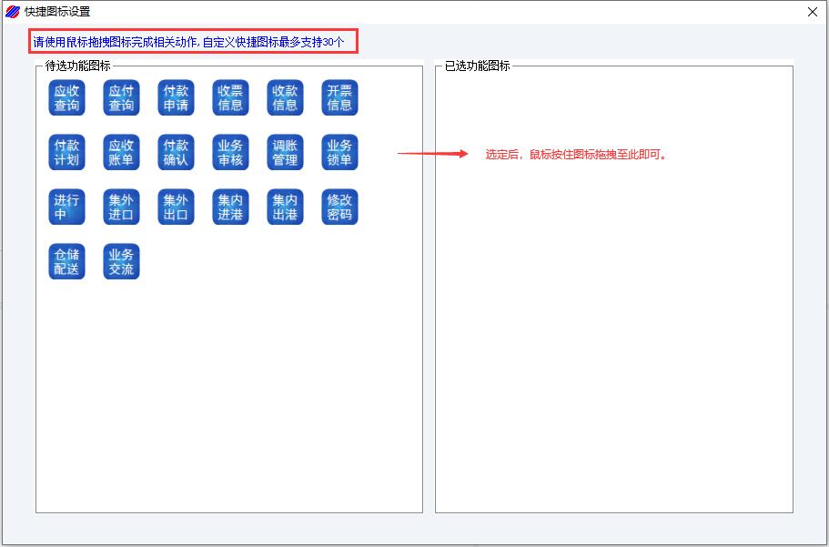 点击“快捷入口”栏右下角的[快捷设置],将一些常用功能,从"待选功能区"移到“已选功能区”,方便用户直接在“快捷入口”栏点击图标使用。