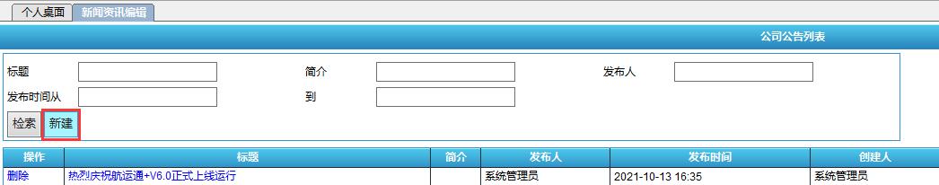 (1)点击[系统管理-新闻资讯编辑],进入“新闻资讯编辑”界面,点击[新建]。
