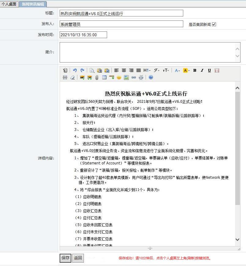 (2)“新闻资讯文稿”编辑完成,点击[保存],10分钟后系统会自动刷新发布。