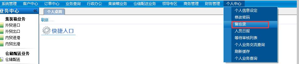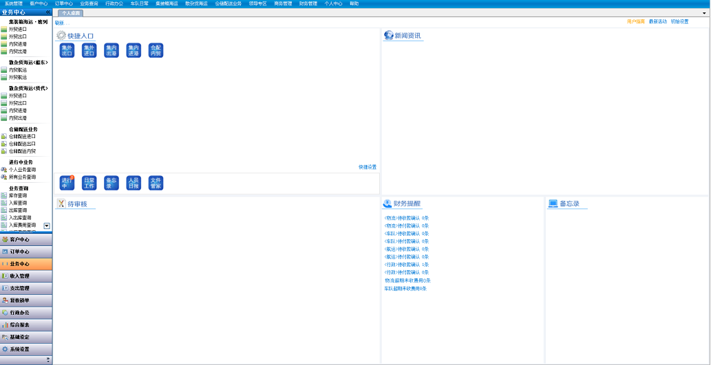 航运通V5.0/V6.0的[个人桌面]由“业务导航栏、快捷入口、新闻资讯、待审核、财务提醒、备忘录”六个部分组成。