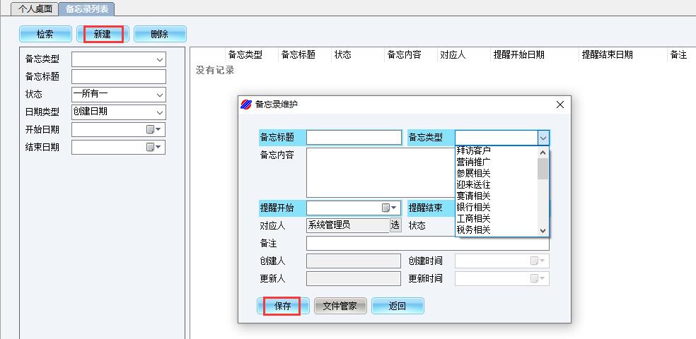 (2)点击[新建],录入并保存“备忘录”信息。