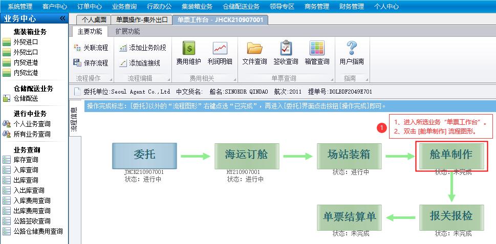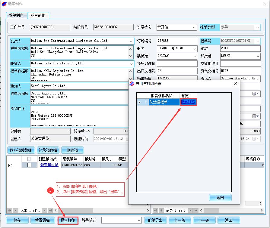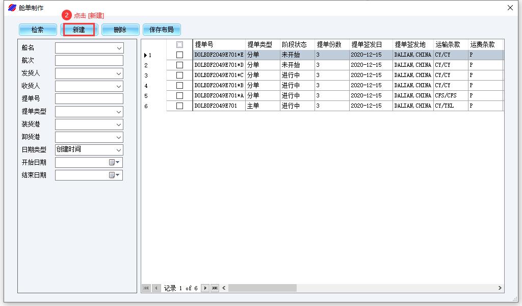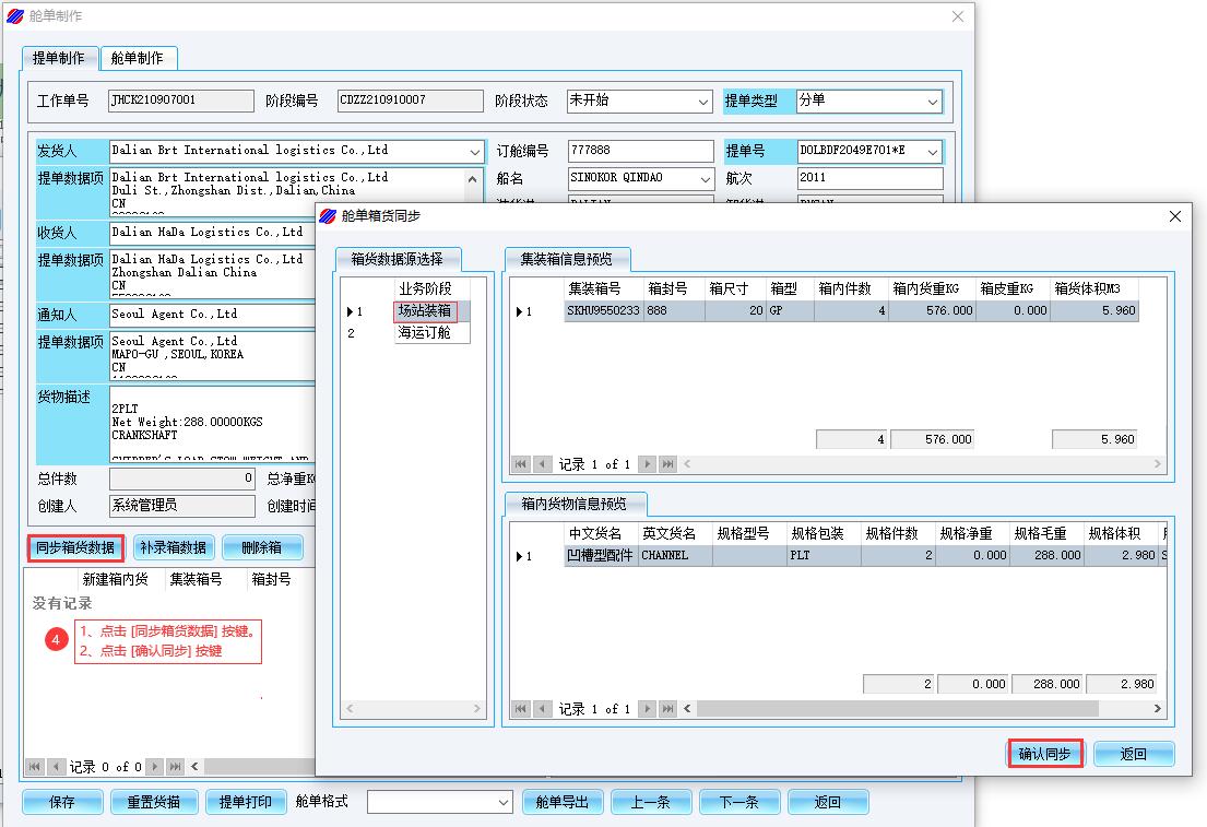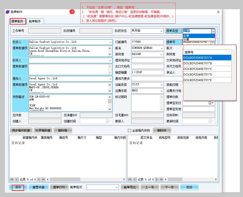 双击[舱单制作] 点击[新建] 完善数据并[保存] 点击[同步箱货数据] 点击[提单打印](散杂货海运:没有此步)