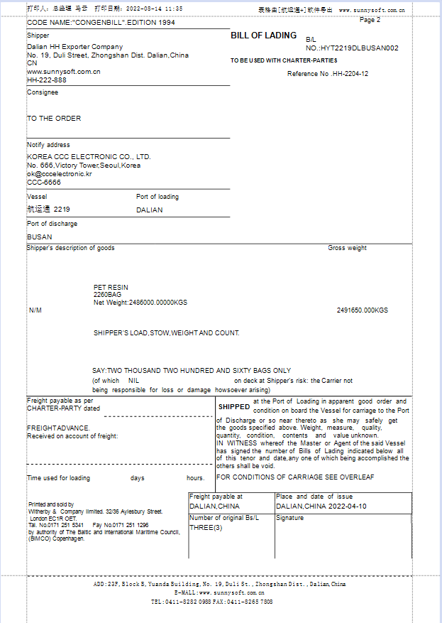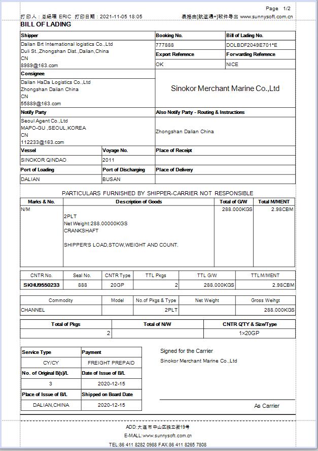通过对世界各大航运班轮公司提单正面数据项及样式的分析研究,航运通软件提供了一个提单标准样式,称之为“航运通提单”。
