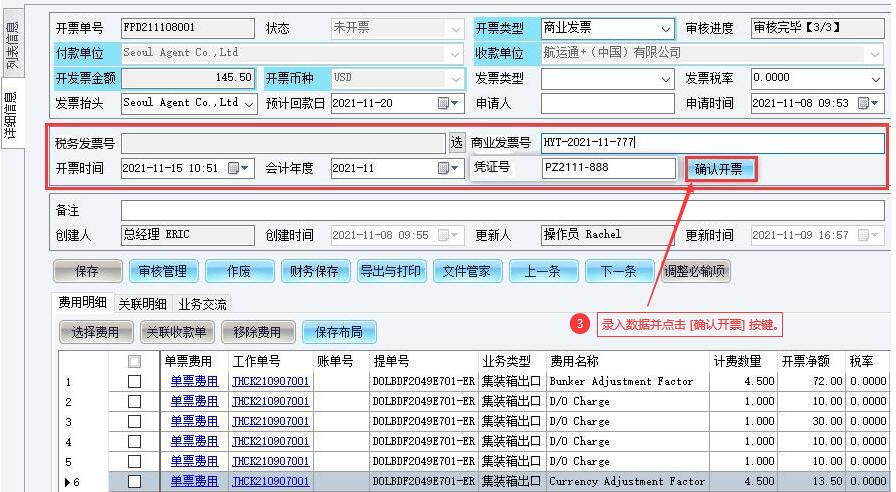开票确认:是指财务人员对“创建开票单”内容、费用明细进行核对,确认无误,出具税务发票或商务发票的财务动作。