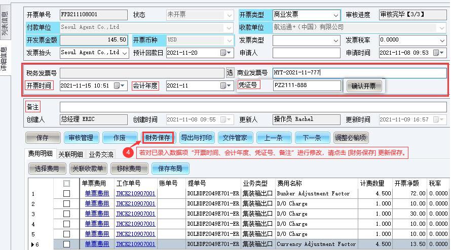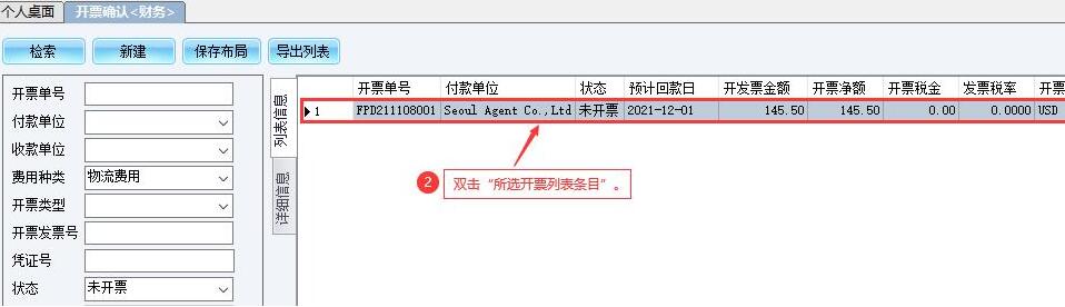 点选“财务管理-开票管理-开票确认<财务>” 双击“所选开票列表条目” 录入数据并点击[确认开票] 修改 点击[财务保存]