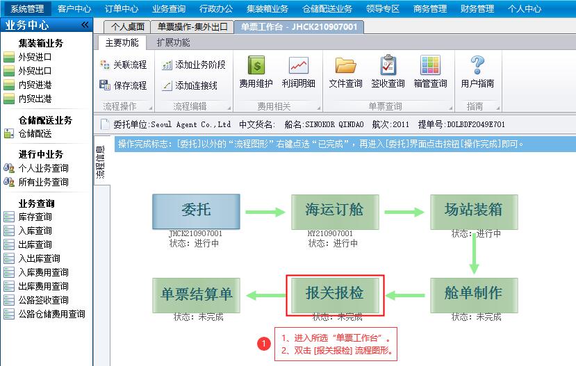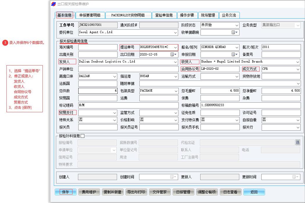 双击[报关报检] 点击[新建] [基本信息]中6个数据项 录入并保存 [申报要素明细]录入并保存 点击[导出与打印]