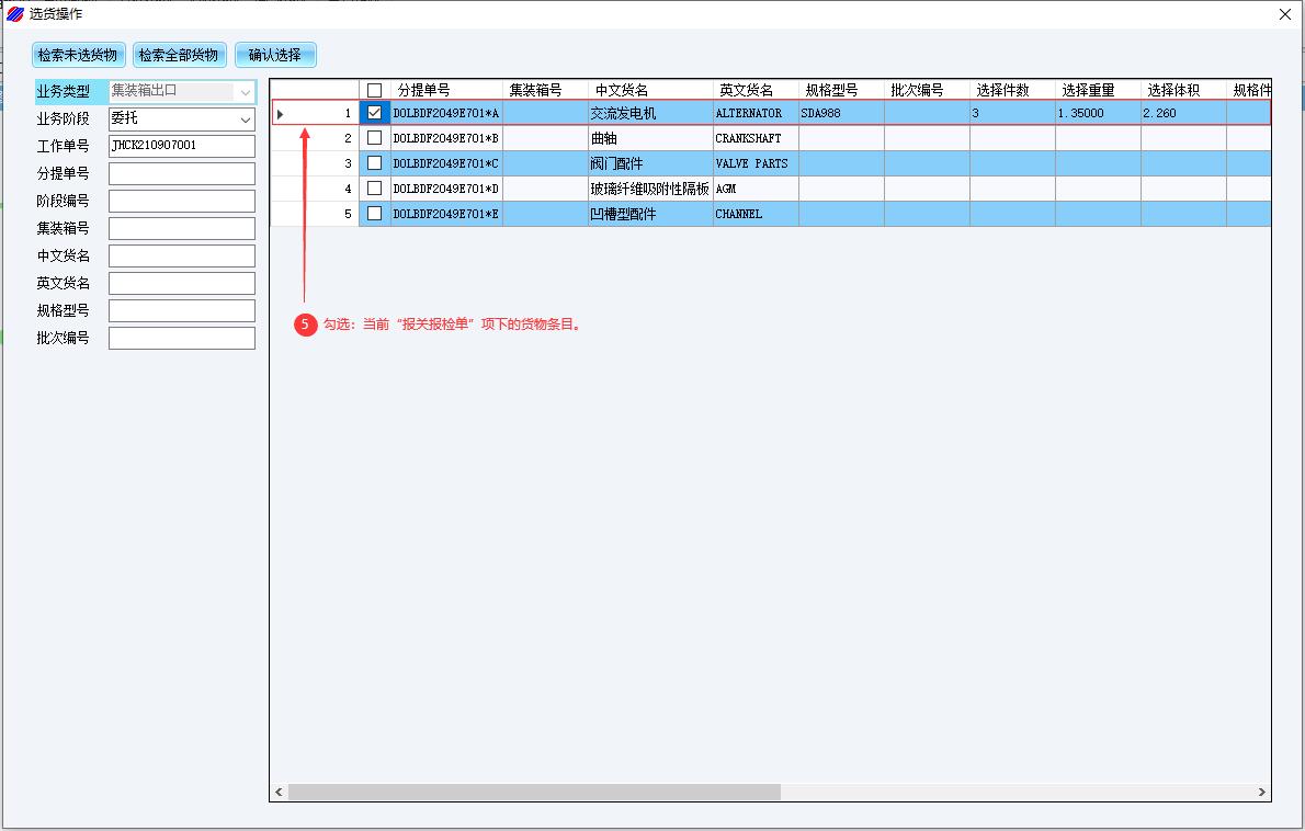 (5)勾选:当前 “报关报检单”项下的货物条目。