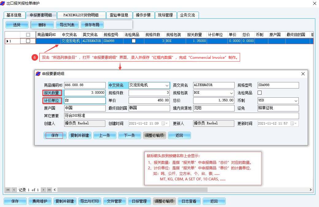 (6)[申报要素明细]录入并保存,完成 “ Commercial Invoice” 制作。