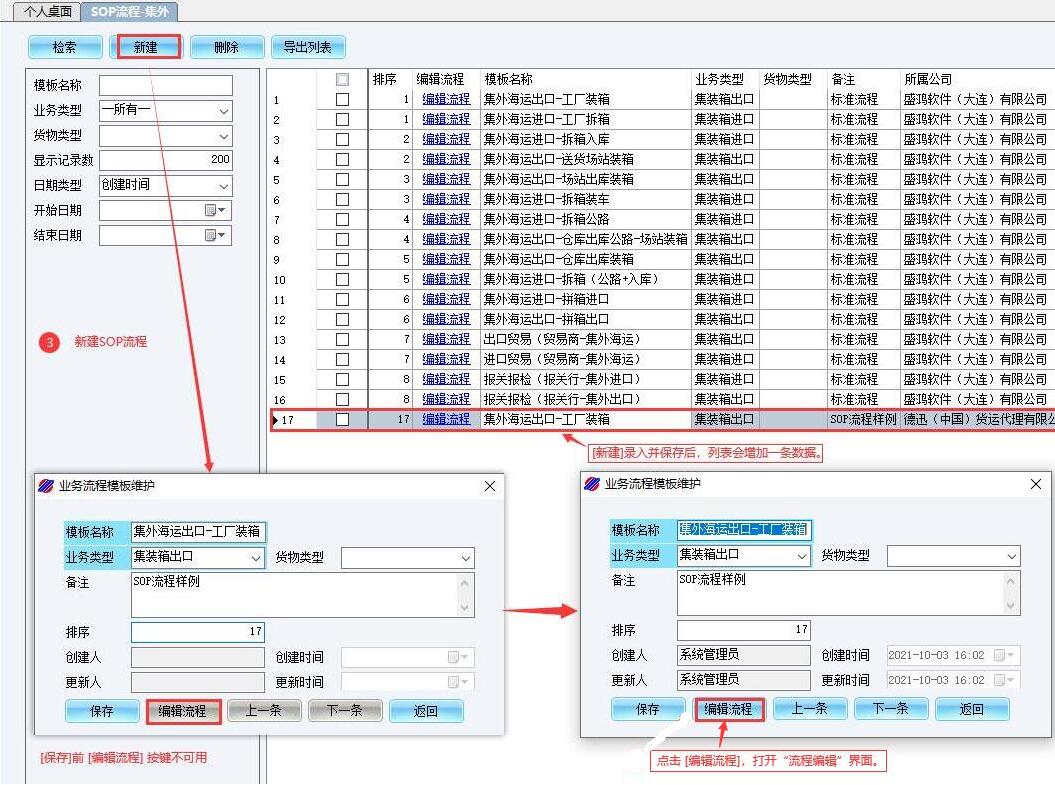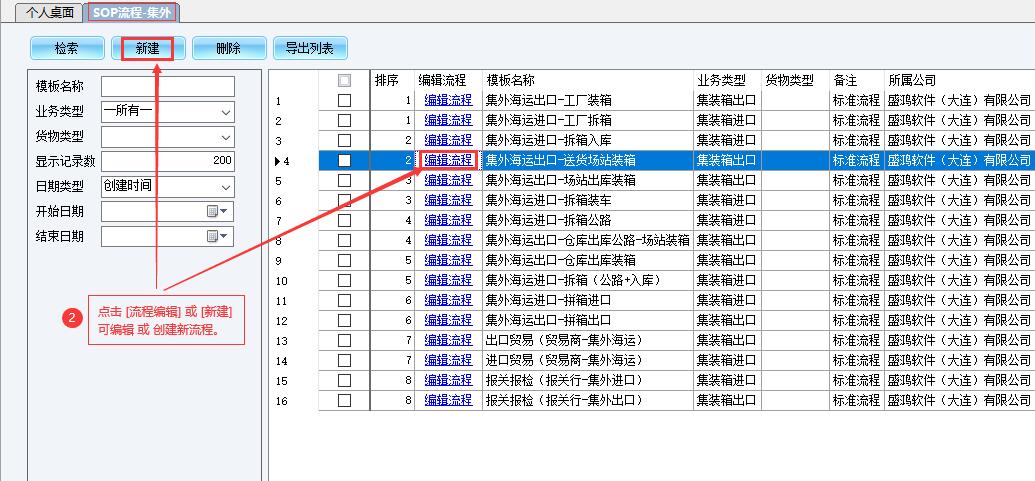 ①【集装箱业务/仓储配送业务 - SOP流程】:既可以在现有SOP模板上编辑,也可以[新建]SOP模板。