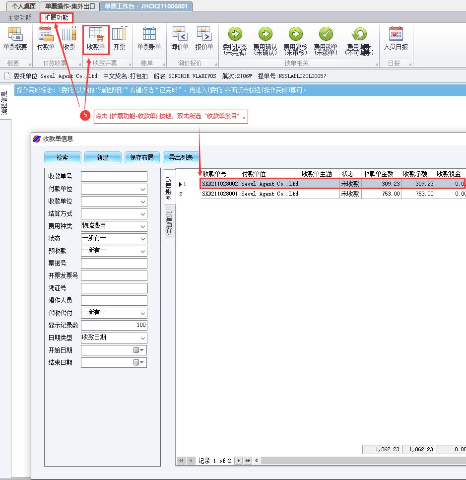 (5)点击工作台中 [扩展功能-收款单],双击所选“收款单列表条目”。