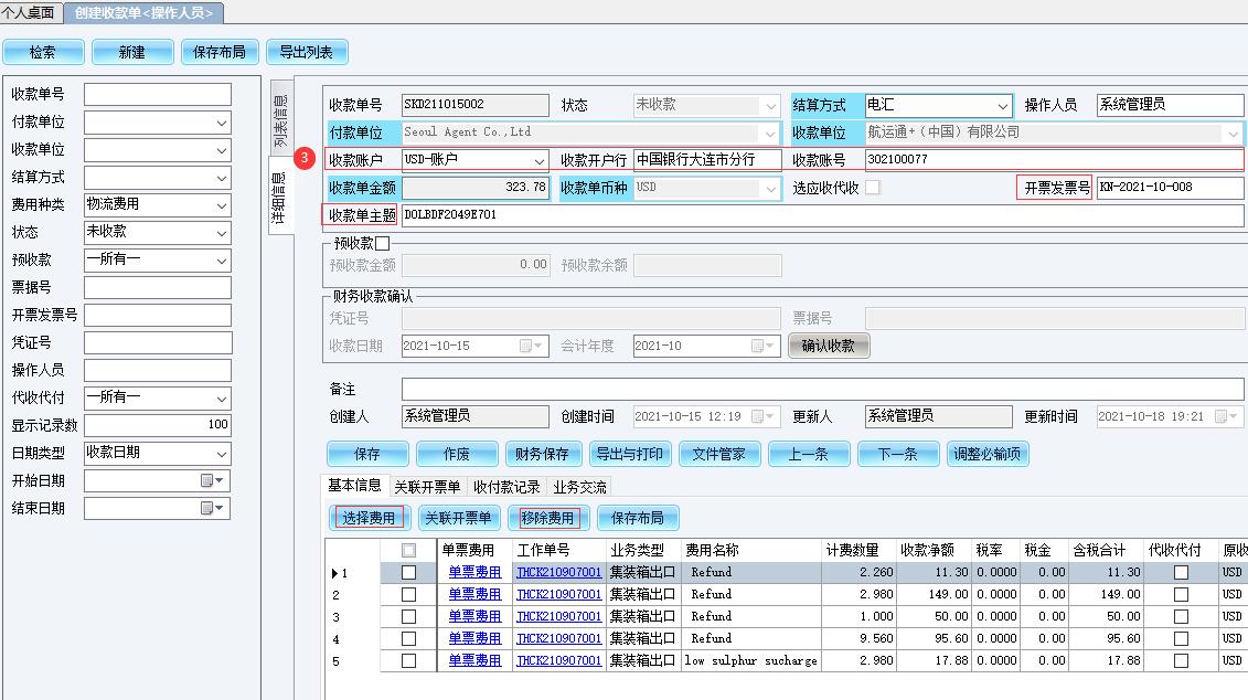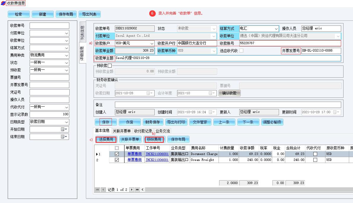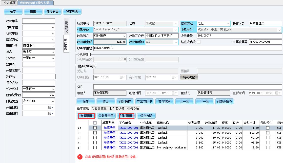 (6)录入“开票发票号、收款单主题”,下拉选“收款账户”,可[移除费用]和[选择费用]。