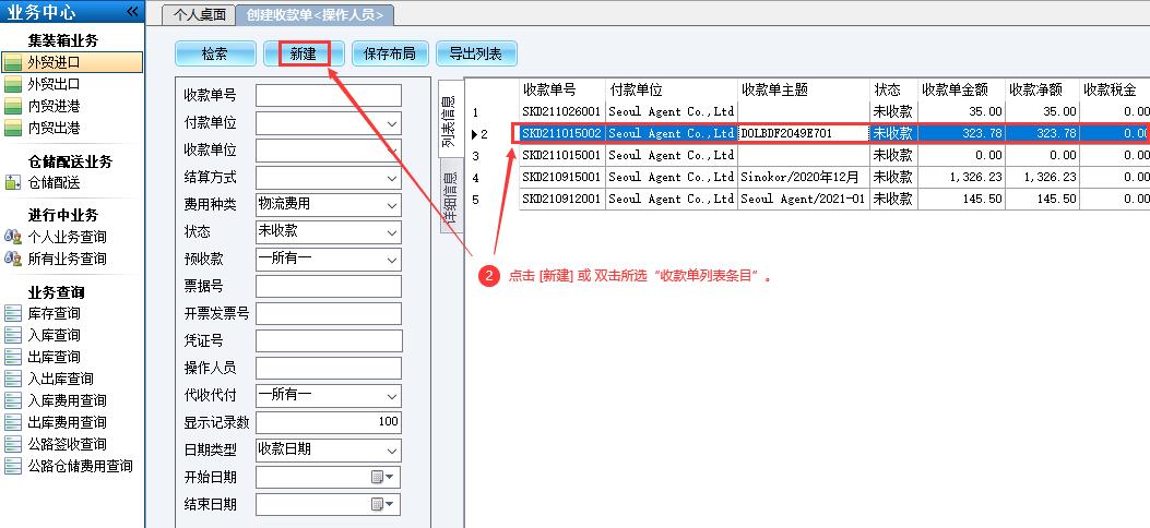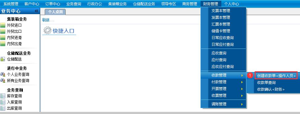 (1)在个人桌面,点击上方菜单 [财务管理-收款管理-创建收款单<操作人员>],打开“收款单列表”界面。