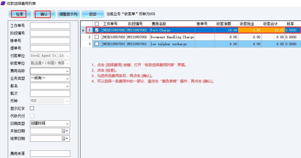c) 费用移除后,可点击[选择费用]按键,打开选择费用界面,点击[检索],系统会列出:本票应收未收当前“付款单位”的所有费用条目,供挑选。