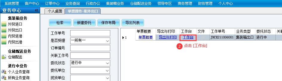 1.2 点击所选业务列表条目中的 [工作台],进入“单票工作台”。