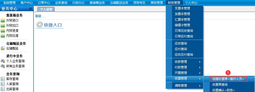 1. 点选 “财务管理-开票管理-创建收票单<操作人员>”