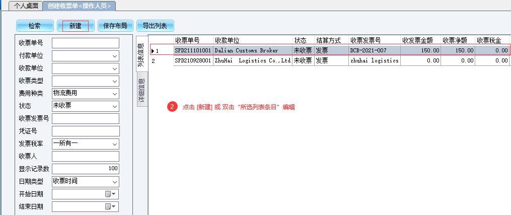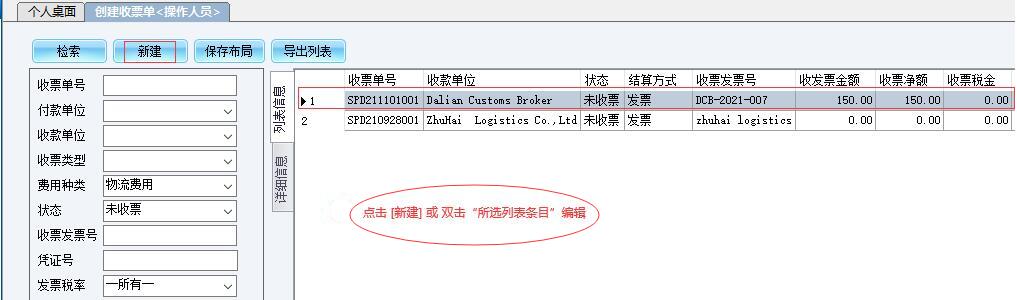 从[单票工作台] 进入 [新建]或双击“所选列表条目” 录入数据并[保存]