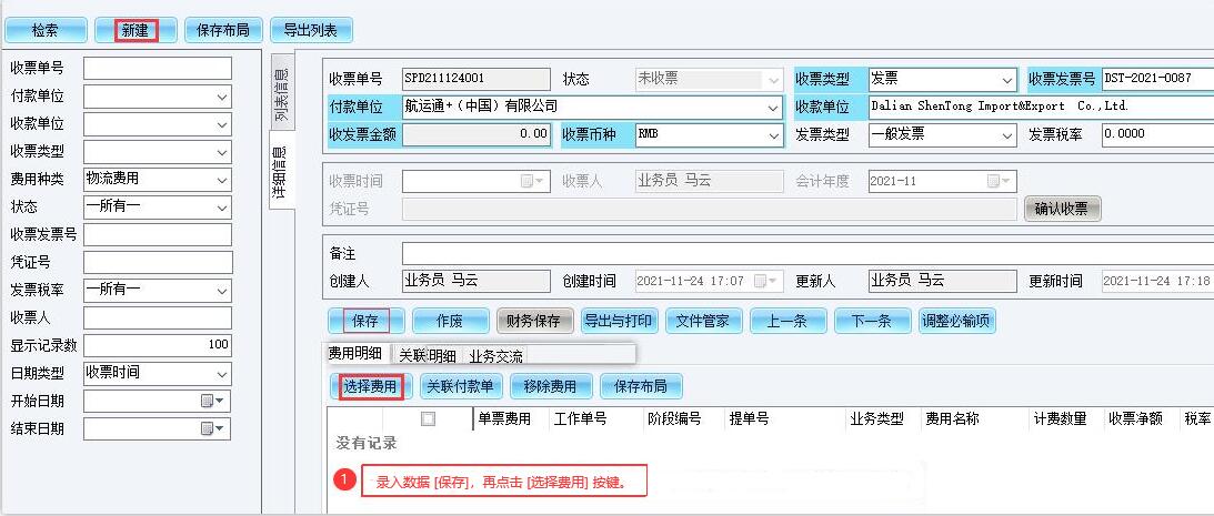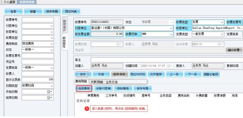3.1 先收票后付款:录入数据 [保存],再点击 [选择费用]按键。