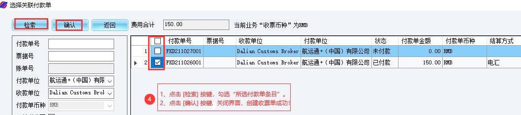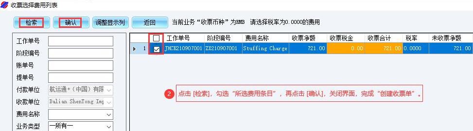 3.2 点击 [检索],勾选“所选列表费用条目”,再点击 [确认],关闭界面,完成“创建收票单”。