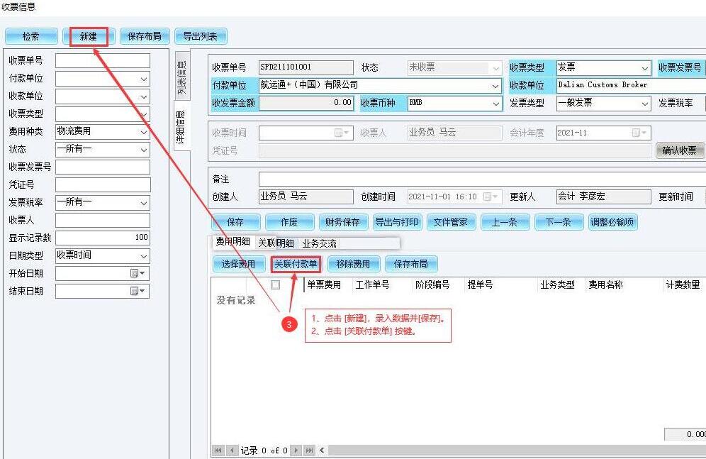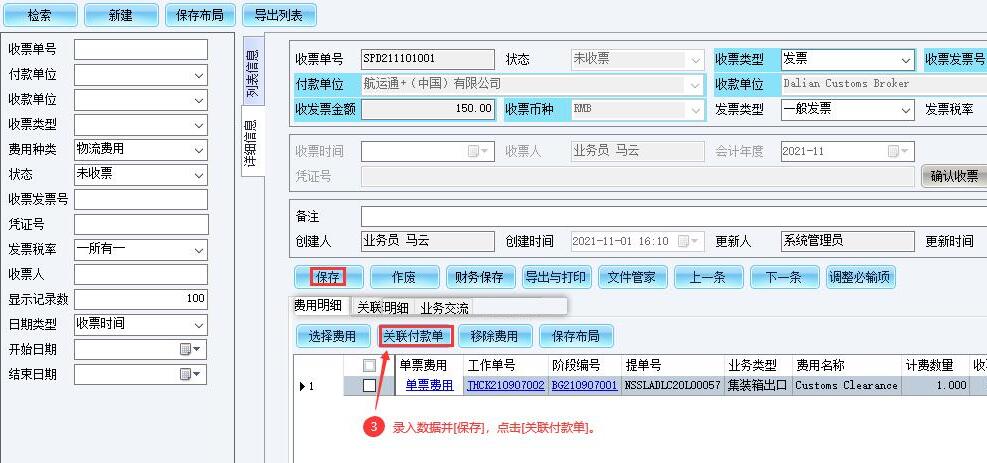 3. 录入数据并[保存],再点击 [选择费用] / [关联付款单]按键。