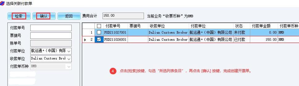 3.4 点击 [检索],勾选“所选付款单条目”,再点击 [确认],完成“创建收票单”。