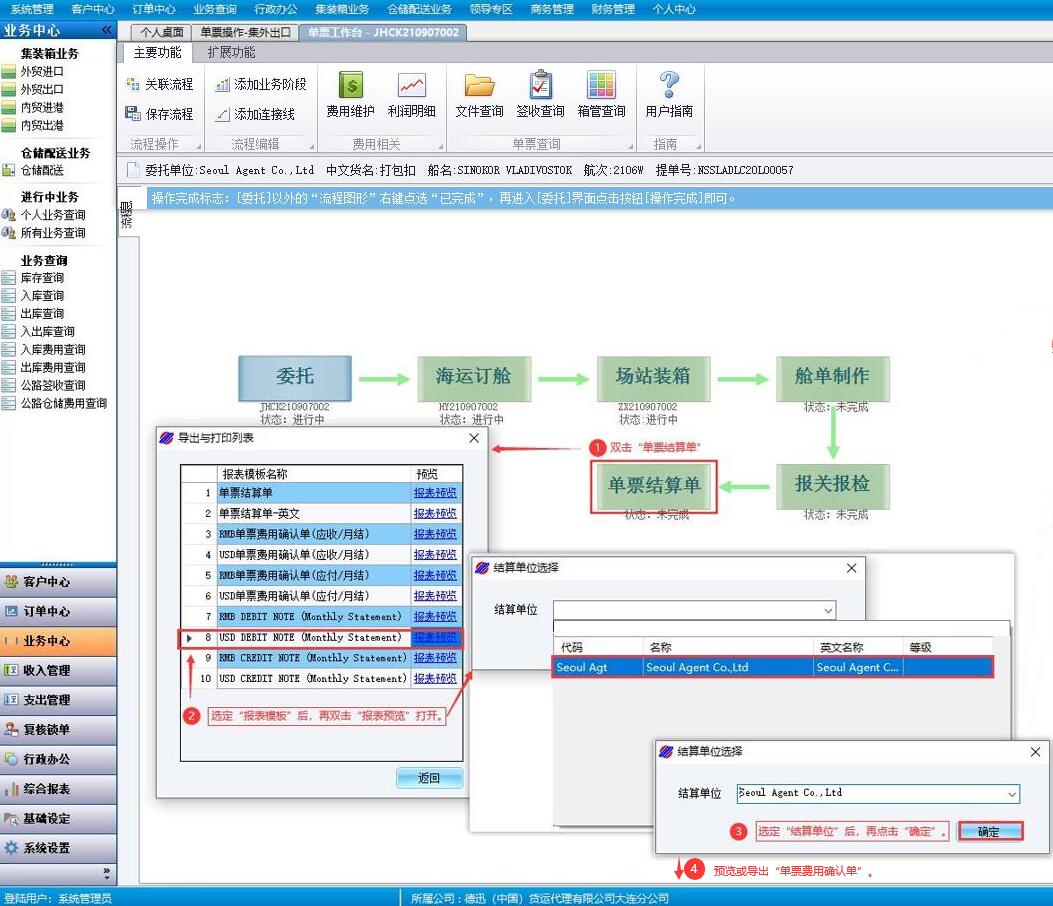 航运通软件内置了“RMB/USD费用确认单(应收/应付-中英文)”表单模板,用户可通过 [工作台-单票结算单/单船结算单]操作使用。